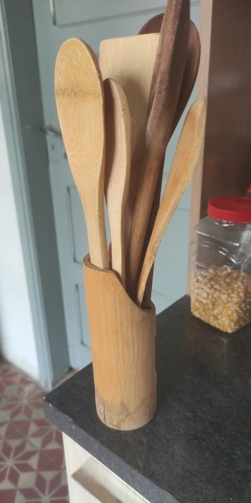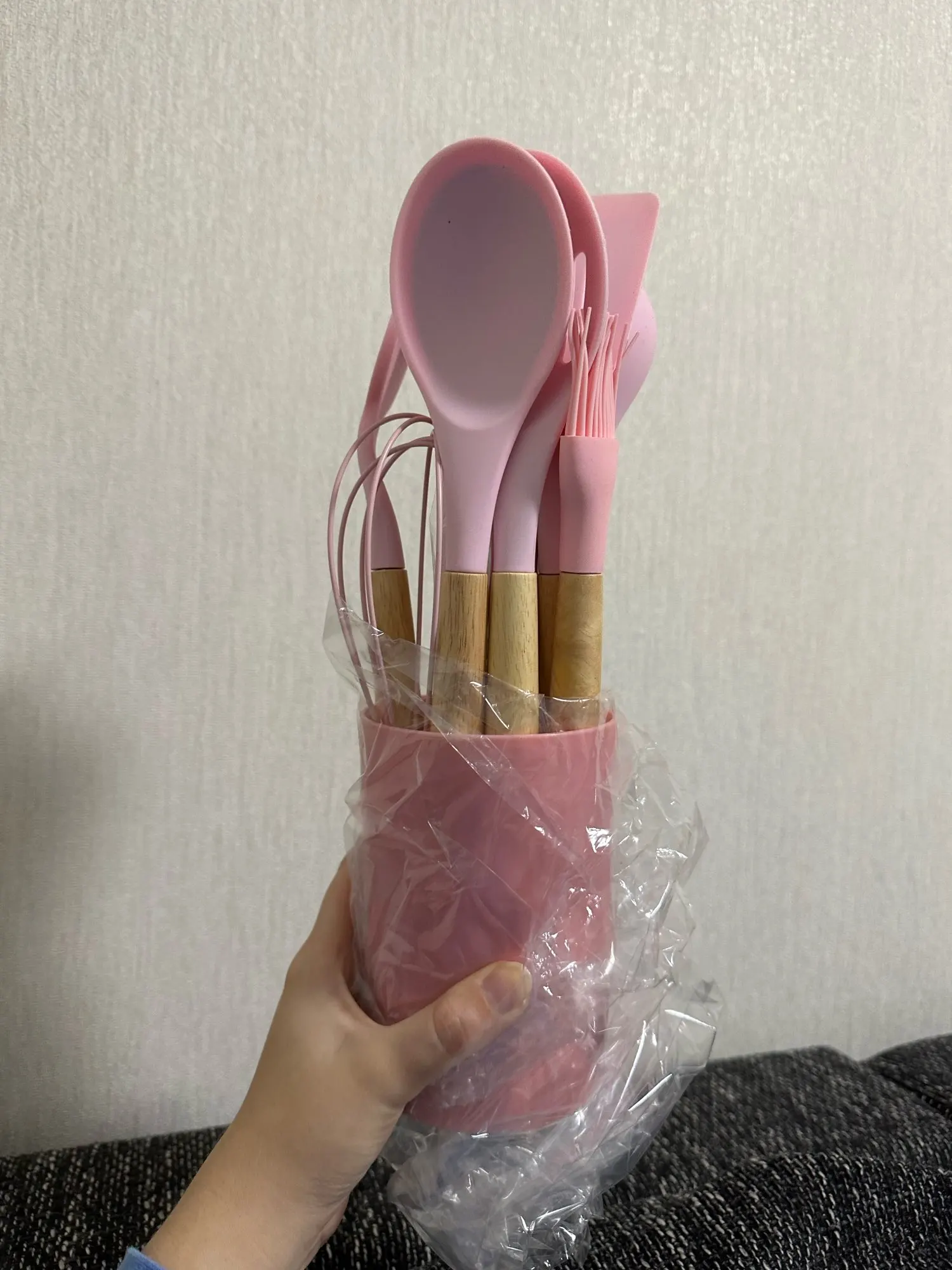 Küchenwerkzeug-Set aus Silikon zum Kochen mit hellem Holzgriff